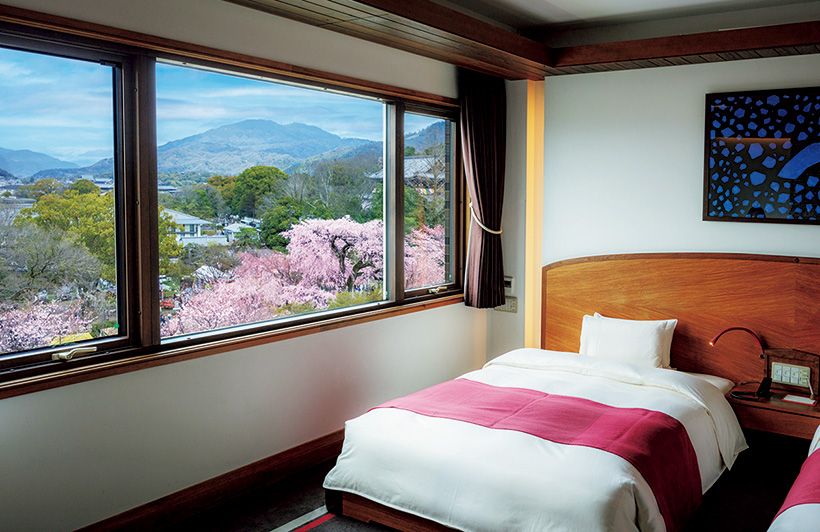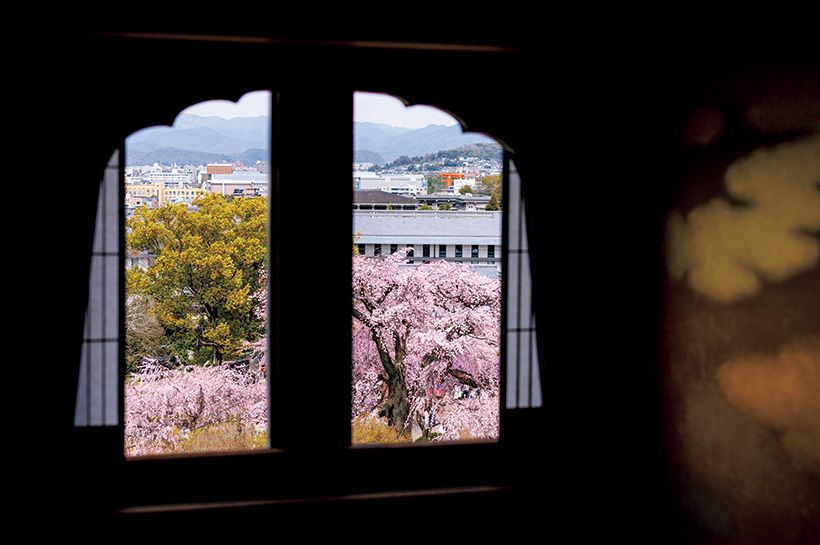 本館2階「貴婦人の間」や最上階の和室「御成の間」(宿泊者のみ見学可)は、枝垂れ桜が一望できるまさに特等席。
