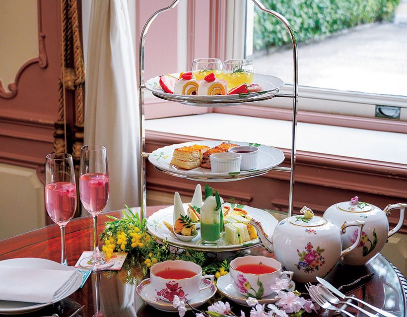 アフタヌーンティーは「迎賓の間」で。春は桜やいちごを使ったスイーツが勢揃い。
