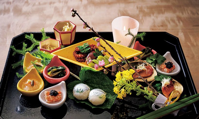 日本料理の「割烹 いずみ」より。旬の京野菜や魚を使った八寸は彩りも豊か。中央の器には、飯蛸と一寸豆。花わさび、のれそれ(穴子の稚魚)、このこ(ナマコの卵巣で珍味)、つくしの酢の物も添えて。飾りで、桃の花、菜の花、わさびの葉っぱなどを用い、春を感じさせる。