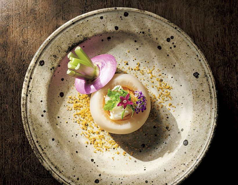 イタリア料理の「リストランテ ラ・ルーチェ」では、しつらいに合わせて和のテイストも入れたイタリアンという新しい味を提供。写真は京のかぶを使った一皿。