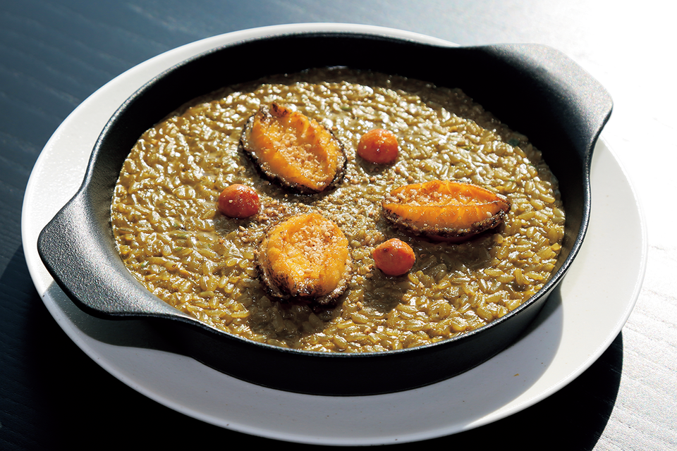 肝でうまみを加えたもち米のリゾットに、柔らかいあわびを添えて。