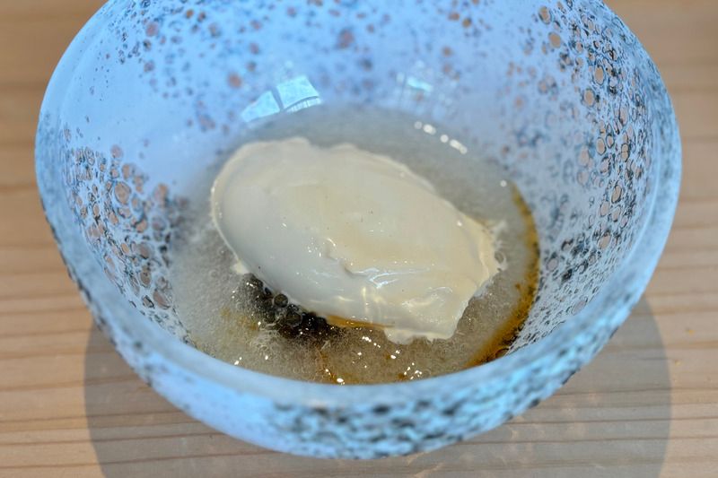 ヤニック氏の「Surprise!」の声とともに登場したのは、今朝思いついたという料理。ボルドー産キャビアを包んだポーチドエッグに、卵を乳化させたソースと出汁を合わせ、醤油をたらりと。和と洋の旨みが見事に調和するスペシャルなひと品です。
