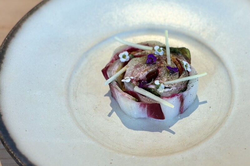 フレッシュなアンディーブに、きんかんや大葉、梅のクリームなどを挟み、ブラックレモンパウダーをふりかけた「赤いアンディーブのサラダ」。きんかんのほのかな甘み、大葉の清涼感、梅干しの酸味などが複雑に重なり、香り豊かに広がります。