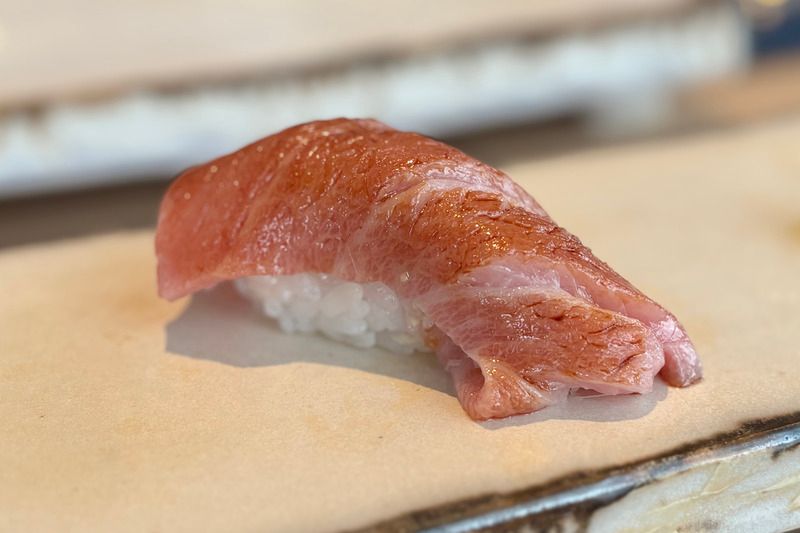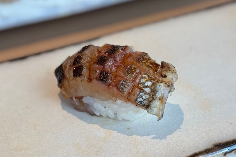 コースの中で一つは登場するという炙り鮨、この日は「カマス」。備長炭を直接ネタに当てて一気に炙ることで、脂を引き出し香ばしさをまとわせます。鼻に抜ける炭の香りとともに上品な脂が口に広がり、なめらかに溶けていきます。