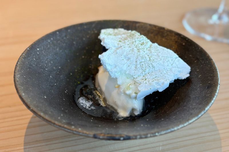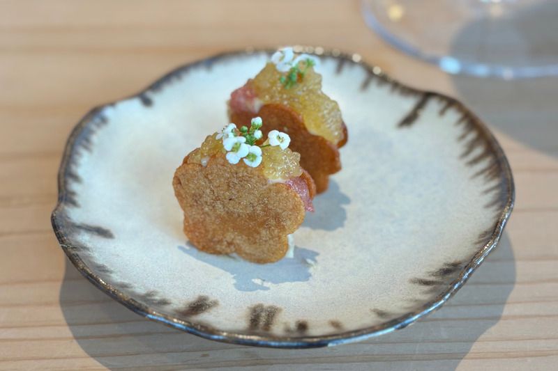 この日いただいたランチコースの一部をご紹介します。スタートは、手でいただく「菊芋のテュイル 赤酢漬け鮪」。サクサクと軽い生地と、鮪のねっとりとした食感のコントラストが楽しいひと品です。鮨を想起させる構成で、ヤニック氏の描くストーリーに一気に引き込まれます。