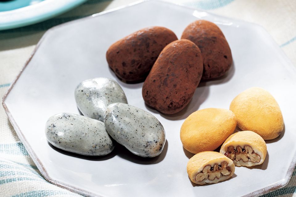 盛りつけた3種は左手前から時計回りに、黒ごまペーストを練り込んだホワイトチョコレートでコーティングした「黒胡麻」、「ココアがけ」、すっきりとした後味のホワイトチョコレートで包みキャラメルパウダーをまぶして仕上げた「キャンディコート」。