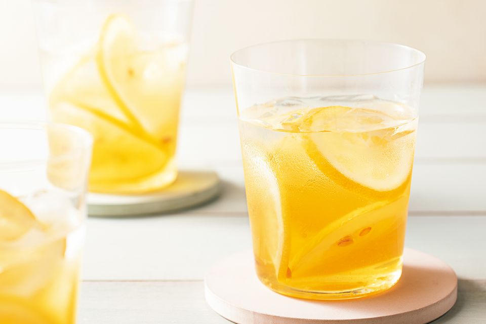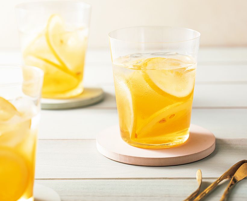 瀬戸内で栽培されたレモンの輪切りが、たっぷりと入った健康ドリンク。氷砂糖の甘さに、レモンとりんご酢の酸味が上品に組み合わせられています。