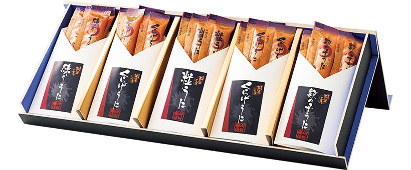 1箱(くらげうに8本、粒うに、練りうに、数の子うに各4本の計20本入り)3000円