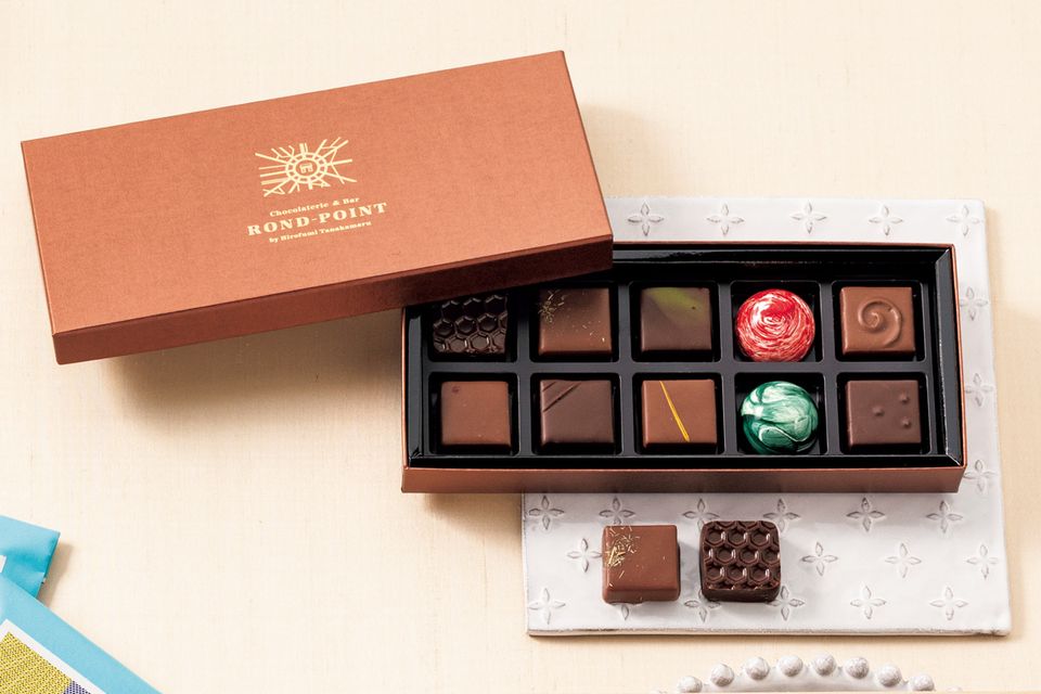 山椒やレモングラスといったハーブを用いた爽やかなショコラをはじめ、フランボワーズのキャラメルとはちみつを組み合わせた鮮やかな赤の半球形ショコラなど、田中丸博文シェフのユニークな感性が薫り立つ「ボンボンショコラ10粒」4752円。スペシャリテの「シナ蜂蜜」は、ダークチョコレートの苦みがはちみつの香りをくっきりと引き立てるひと粒。