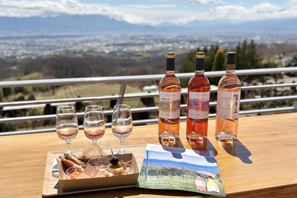 金~日曜・祝日には、各ロゼワインに合うおつまみがセットになった「春色マリアージュプレート」(数量限定)も楽しめる。甲府盆地を一望できるテラス席で優雅なひとときを。