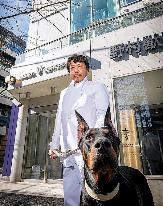5代目ドーベルマンの愛犬、ビクターと野村潤一郎院長。Vセンタービルの前で。