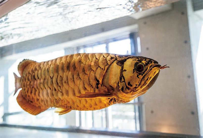 受付のある2階に上がると、まず目に飛び込んでくるのが、大きな水槽の中で悠々と泳ぐ金色の帯のようなゴールデンアロワナだ。
