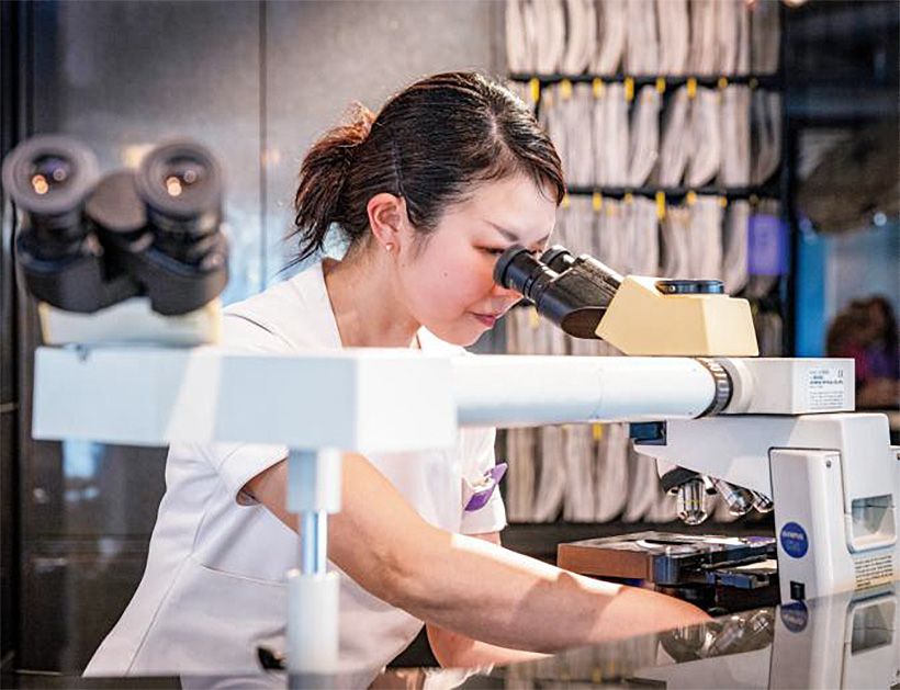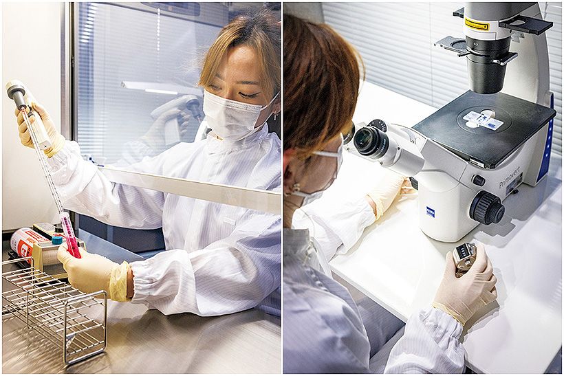 再生治療に使う幹細胞は患者の弱っている部分を修復する。培養した細胞の数を手もとのカウンターで1個1個数えて選別する。