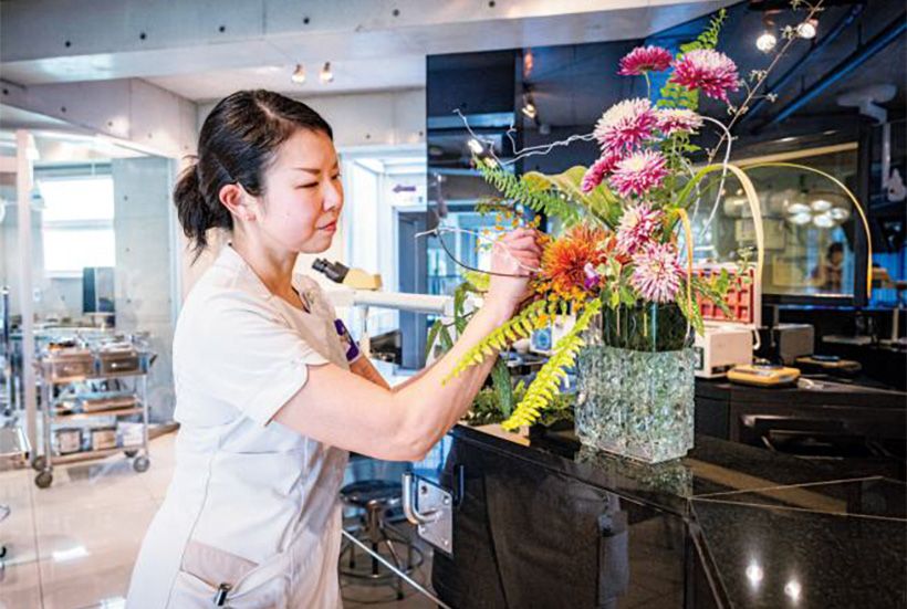 「飾ってある花が造花だと余裕がない感じですよね」と院長。本物しか置かないのが信条なので飾り花は生花だ。正月やクリスマスの飾り付けも欠かさない。