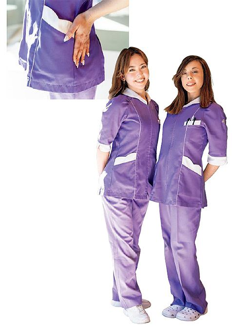 病院の看護師さんたちの服は野村院長のデザイン。襟や袖口が白になっているのは「汚れやすいところに汚れが目立つ色を持ってきている」ため。ドクターはカタログから好きな白衣を選んでいいことになっている。