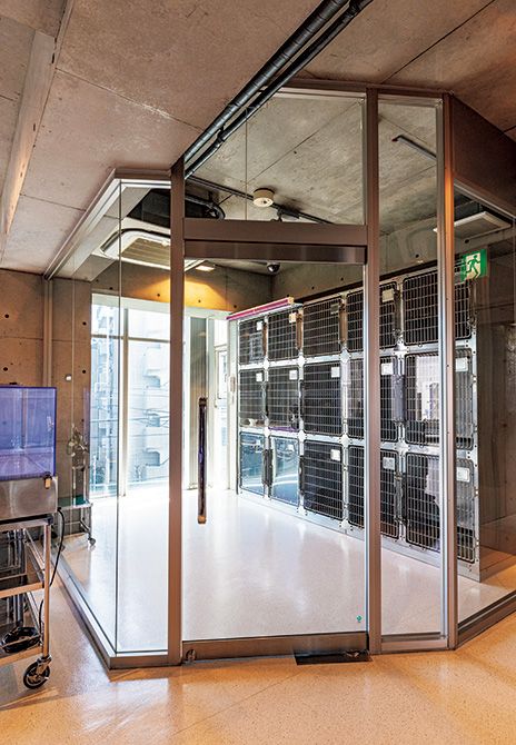 暖かい部屋を好む猫の入院室は、室温が高めに設定され、外の風景を見て過ごす猫たちのためにケージは窓際に設置されている。犬には大型犬の場合十分な広さの個室がある。さらに屋上のドッグランが同じフロアにある。