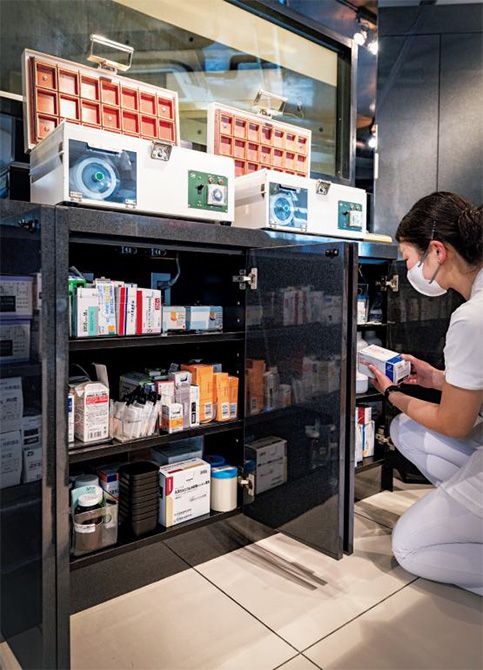 飼い主からも薬の名前が見える棚。箱ごとの薬の整理によって使用期限も間違えることがない。
