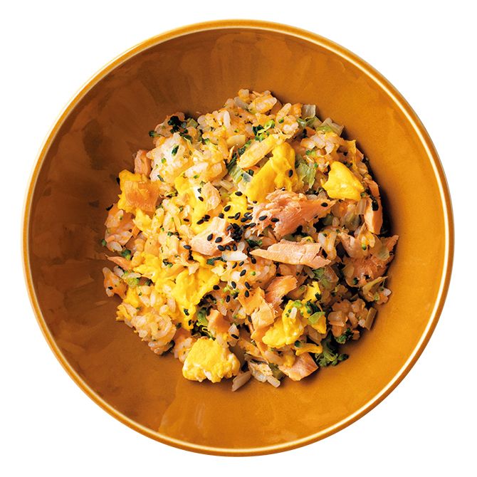 焼き鮭と野菜ごはんを香りのよいごま油で炒め、食欲をそそるチャーハン風に。鮭には胃腸を温める働きがあります。ごはんを炒めるときに使うごま油は、寒さで乾燥した皮膚などを潤す効果も。また、腎の働きを補う作用のあるキャベツやブロッコリーを使うことで、抵抗力のある強い体を作ります。