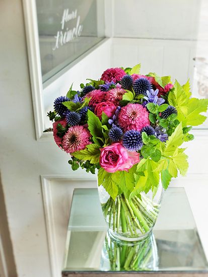 繊細な花びらのボール状のピンクの花がエキナセア。花心の筒状花だけがこんもりとした形になります。これは‘ピンクボールビュー’という品種。似た花色のバラ‘ローズシノ’にルリタマアザミとアガパンサスのブルーを加え、華やかでエレガントなバースデーの贈り花に。