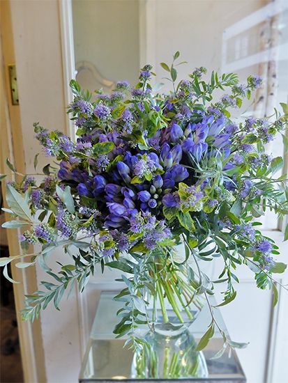 リンドウ‘マイティラブ’をメインに、マットなブルーのカリオプテリス‘サマーソルベット’、アカシア‘ブルーブッシュ’を合わせ、シルバーリーフのロシアンオリーブを加えて秋の青いブーケに。リンドウのひときわ鮮やかな青をご覧ください。