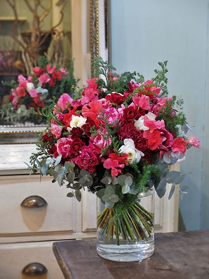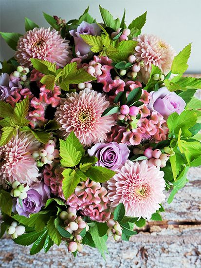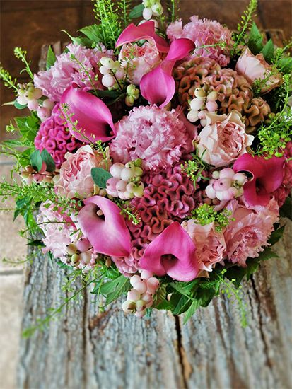 ピンクが好きなお母さまに娘さんから誕生祝いの贈り花。リシアンサス、バラ、カラーと大きな花の間に加えているのが、ケイトウ‘アスカセレクト キャンディー’。ニュアンスのあるピンクのグラデーションがアレンジ全体をしゃれた雰囲気にしてくれます。