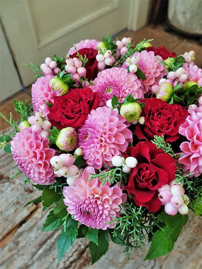 「紀子の花」の高木紀子さんが栽培したかわいらしいピンクのダリア‘ハマリローズ’をメイン、深紅のバラ‘ヴァーグ+’、シンフォリカルポスのかわいらしい実を合わせたアレンジ。お母さまの還暦祝いに、娘さんからの贈り花です。ボール咲きのダリアはこの立体感も大きな魅力です。