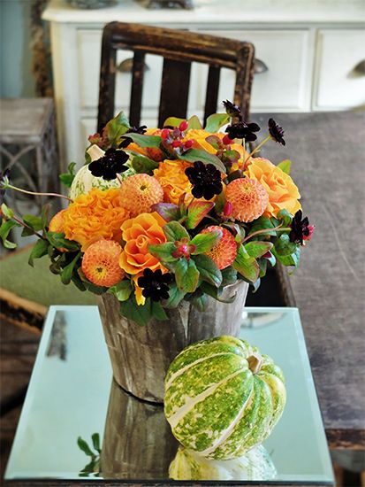 お部屋に飾るハロウィンのアレンジのオーダーをいただき、すぐに神田さんのバラ‘マンゴーリーバ’を主役にしようと決めました。オレンジ色より少し優しい印象の花色はまさにマンゴーの色。波打つ花弁の重なりが見事な美しさです。マイクロポンポンダリアとチョコレートコスモスを合わせ、紅葉ヒペリカムでさらに季節感を出してみました。