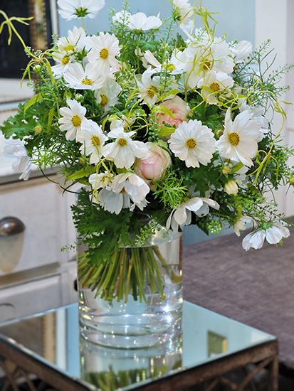 すっきりとした美しさの一重のコスモス‘センセーション ホワイト’をたっぷり束ね、お母さまの誕生日のお祝いに。挿し色で淡いピンクのバラ‘ルナ’を加え、タラスピオファリム、メラレウカ、リキュウソウなどのみずみずしいグリーンを添えたブーケです。