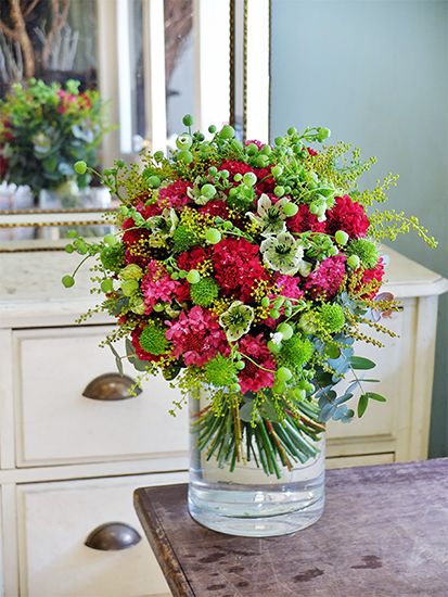‘ロココスカーレット’‘スーパーピンク’‘ピューレグリーン’と、赤、ピンク、緑のスカビオサを集めたブーケです。ニゲラ‘アフリカンブライド’、シレネ‘グリーンベル’に銀葉アカシアとユーカリを加えて。お世話になっているガーデナーさんへの贈り花で、温暖地の庭で栽培するのが難しいスカビオサをメインに、というオーダーを受けて制作しました。