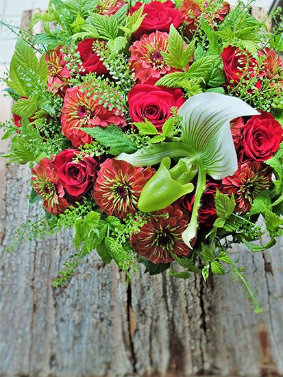生産者の吉村 学さんが‘クイーン’シリーズから改良・育種した‘キング ダークレッド’を利用したアレンジ。つや感のある赤いバラと比べるとマットな質感がよくわかります。その対比も考えて、花選びをしました。赤と緑色の花合わせに、白地に緑色のストライプが涼しげなパフィオペディルムを載せて仕上げました。