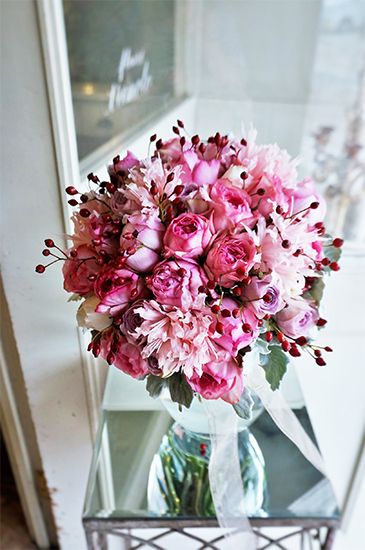お母さまのお誕生日の贈り花です。マムが大好きと伺い、透明感のある美しいピンクのマム‘セイオペラ’をメインに選び、ピンクのケイトウ、淡い紫色のバラ、かわいらしい実のシンフォリカルポスなどと合わせ、秋の大人ピンクのアレンジに。