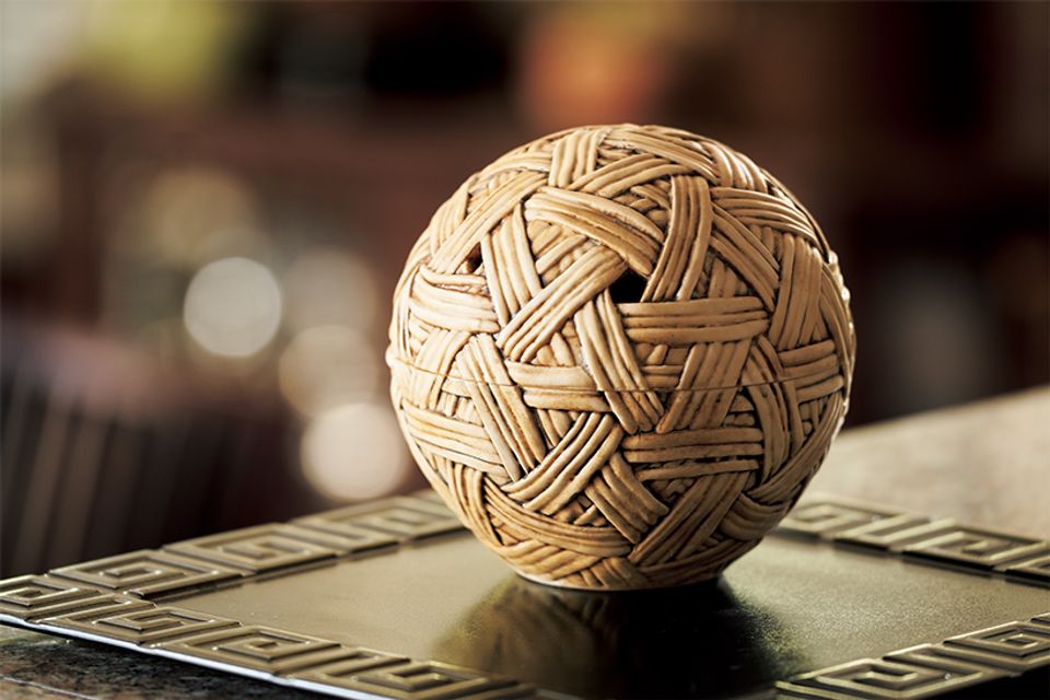 テーブルの主役は円筒形をした漆のヴィンテージティーボックス。70~80年ほど前にミャンマーで作られたもので、今ではコレクターもいる稀少なアイテムになっています。優子さんはこの漆のボックスに合わせて、シノワズリな柄が美しい布地を壁に飾りました。漆のボックスにはティーポットやカップを入れて、蓋は裏返して落としを入れて花器にしました。「ヴィンテージならではの趣きある佇まいが魅力です」と優子さん。そしてタイでよく目にするセパタクローの籐球がモチーフの蓋物を並べました。チェンマイで見つけた工芸品を主役にした、美しいシノワズリな趣のテーブルが完成しました。