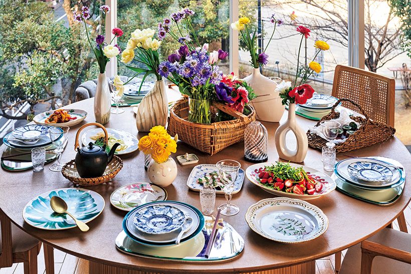 「春のピクニック」気分を卓上で楽しむ取り合わせの軸は「植物」モチーフ。ヨーロッパ各国の名窯ブランドのプレートが綺羅星のように並ぶ。一方で花あしらいには素朴なかご。一体感を整えながらも高級品が並ぶ緊張感を軽やかに外すのも、もてなしの極意。銘々のナプキンも同じ趣旨で、遠慮せず使える木綿の刺し子が選ばれた。器を愛でる楽しみの一方で、くつろげる雰囲気づくりも集いには欠かせない。