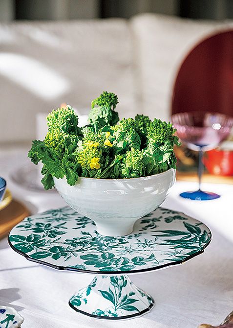 Tip4】ケーキスタンドは卓上に立体感を生むすぐれもの。平板になりがちな食卓に、ケーキスタンドで高さを出すと視線が上がり、テーブル全体を見通す楽しみが生まれる。ケーキスタンドはグッチの「ハーバリウム」。上にのせた白磁は中里博恒 作のオリジナル(HIDEYA HOUSE)。
