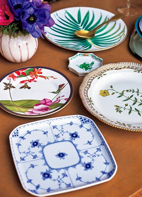 【Tip1】テーマに合わせてモチーフ統一、ここではボタニカル柄で。洗練された植物柄が並び、植物園のよう。上から時計回りにエルメス「パシフォリア」、ヘレンド「アポニー」、ロイヤル コペンハーゲン「フローラダニカ」と「ブルーフルーテッド」、ウェッジウッド「ハミングバード」。