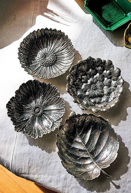 Tip6】柄違いのシリーズものは程よい統一感で贅沢の極み。異なる器から共通点を見つけて取り合わせるのが器遊びの妙味ならば、程よい統一感があり、それぞれがユニークピースである柄違いのシリーズものはそれだけで卓上の花。シルバーウェアはイタリアの老舗ブランド、ブチェラッティ。