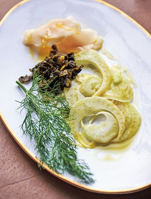 春にこそシックな取り合わせで。器談義に花が咲く器好きの友人と過ごすアペロタイム。基調に選んだ茶系は秋色と思われがちだが、春の食材の瑞々しさを引き立てるべく抑えた色づかいで。織部焼の手鉢、古いロイヤル コペンハーゲン、古九谷焼の小皿が並ぶ。蕾菜を盛ったのは朝鮮時代の白磁の浅鉢。価値からすれば普段づかいではないが、料理を盛り本物の器が持つ力を味わうのが妙味。