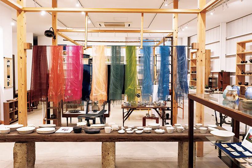 もえぎBASEでは藍染めのストールなど益子近郊の工芸品も扱う。
