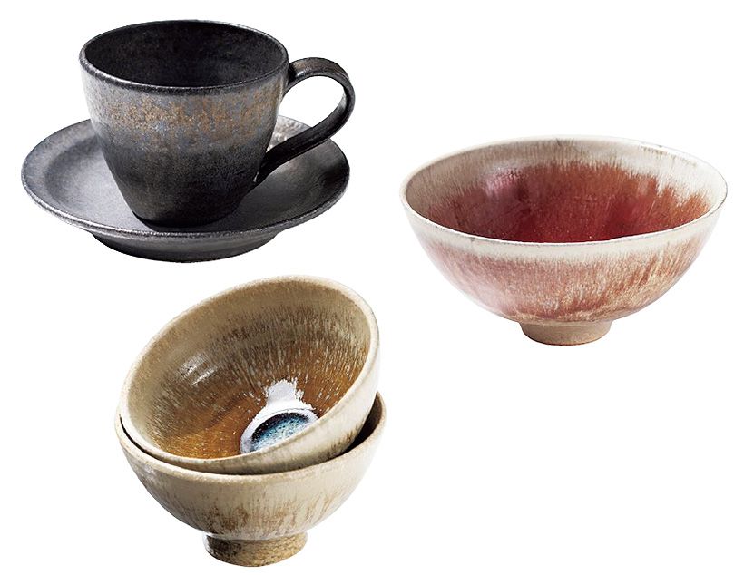 オリジナルブランド「汲古(きゅうこ)」の表情豊かな器は、独自に配合した5種の釉薬を使用。写真の釉薬は「黒金(くろかね)」(左上)、「胞子」(右上)、「粉雪」(左下)。
