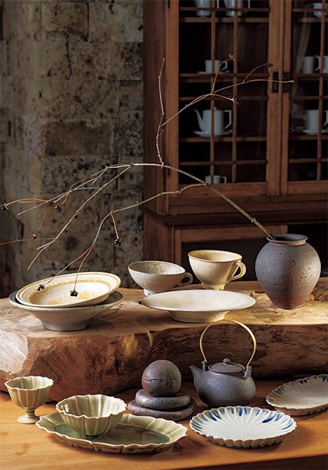空間に合う、シックな色合いや自然な質感のある器をセレクト。上段の左から5点は25歳の若手作家、木村颯太 作。上段の右端と下段中央は、櫻井 薫 作。下段手前は、宮田竜司 作。