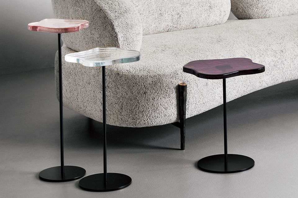 京都の寺社の池に浮かぶ睡蓮の葉に着想を得たユニークな曲線の天板は、ベネチアンガラス製で2センチの厚さがあり丈夫。