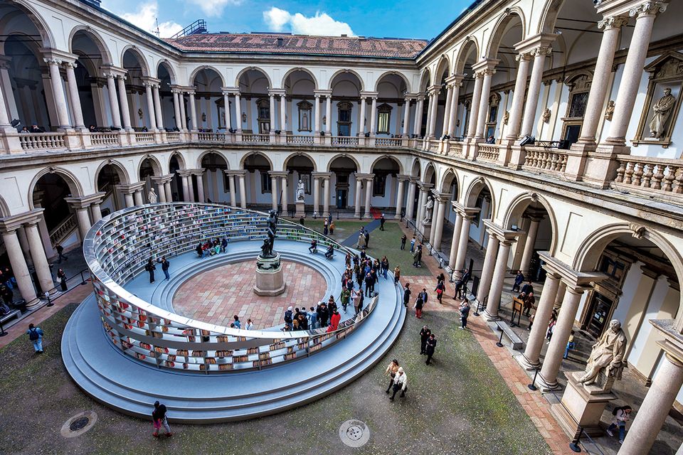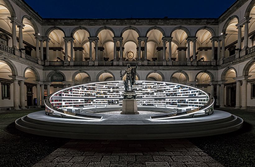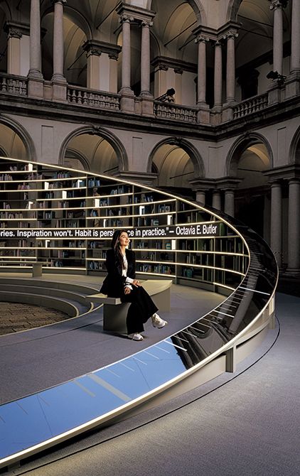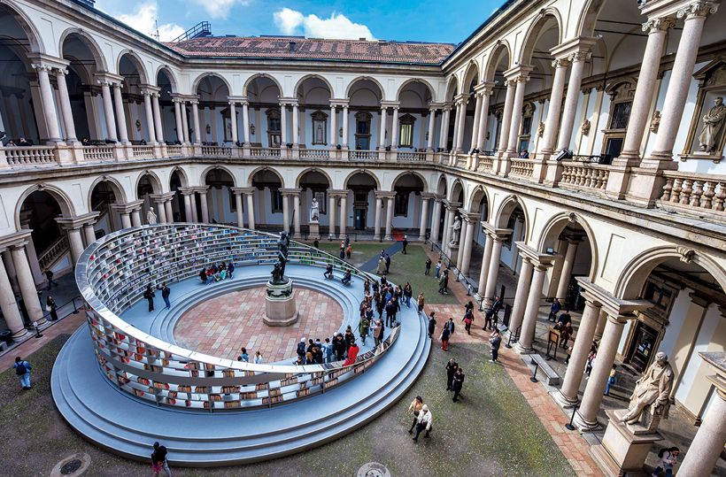 ブレラ美術館のコルティーレ・ドノーレ(名誉の中庭)で行われたミラノサローネの併催文化プログラム「光のライブラリー」。会期中9万5300人が訪れた。英国人アーティスト、エス・デヴリンによる3000 冊の書棚で構成された直径18メートルの「知の道標」といえる彫刻はゆっくりと回転し、日時計のよう。ブレラ美術館に併設されているブライデンセ国立図書館の高い書棚にインスピレーションを得て、造られたもの。
