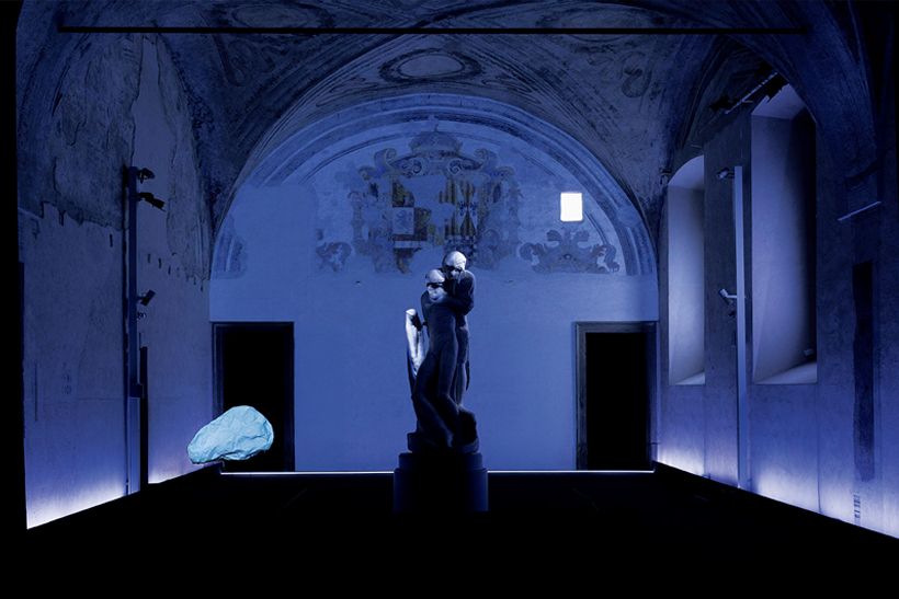 スフォルツェスコ城ロンダニーニのピエタ美術館で開催された「マザー」展会場。米国人演出家ロバート・ウィルソンによる光と音楽の演出のもと、ミケランジェロの未完の遺作と向き合う、ミラノ市文化局とのコラボレーション企画。(Photo/©Lucie Jansch)