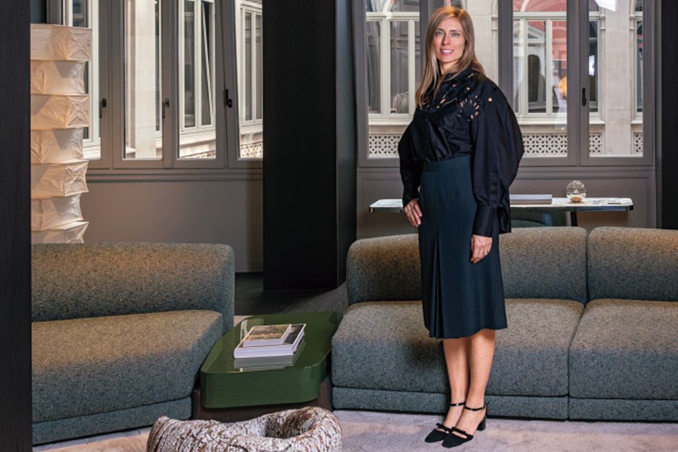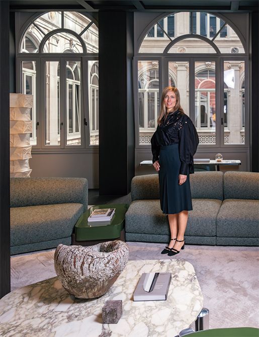 1934年創業のモルテーニでマーケティング&コミュニケーション部門を率いるジュリアさん。クリストフ・デルクールによる新作に囲まれて。ソファ「エミール」、コーヒーテーブル「オディール」、手前のコーヒーテーブル「メイリス」。Palazzo Molteni( ViaManzoni 9, Milano)