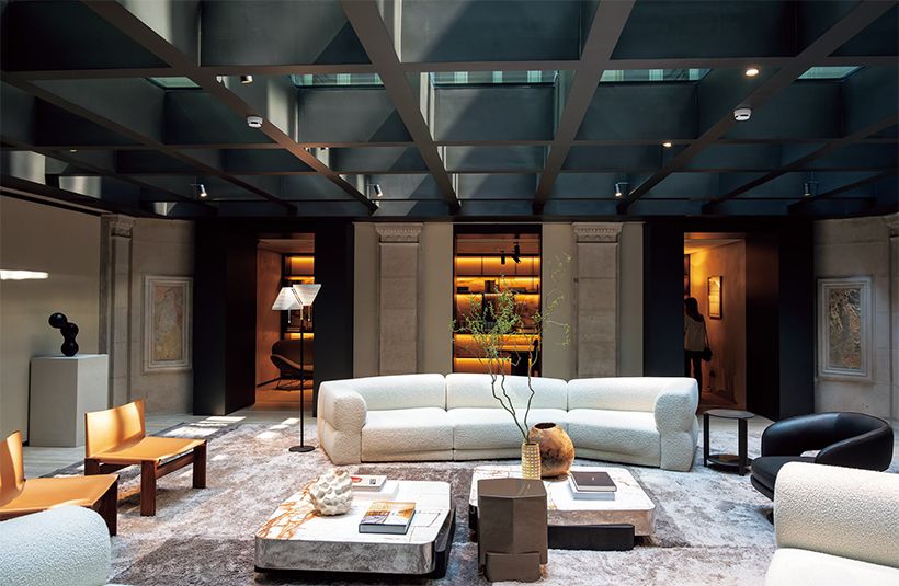かつての中庭は、ガラス天井を配したリビングに。クリストフ・デルクールによる中央のソファ「エミール」は、芸術家ルーチョ・フォンタナの“切り裂き”手法に着想を得た側面と背面のラインが特徴。手前のコーヒーテーブル「オディール」と「レア」も同デザイナーの新作。左手のチェアは、アフラ&トビア・スカルパの名作「モンク」の復刻版。