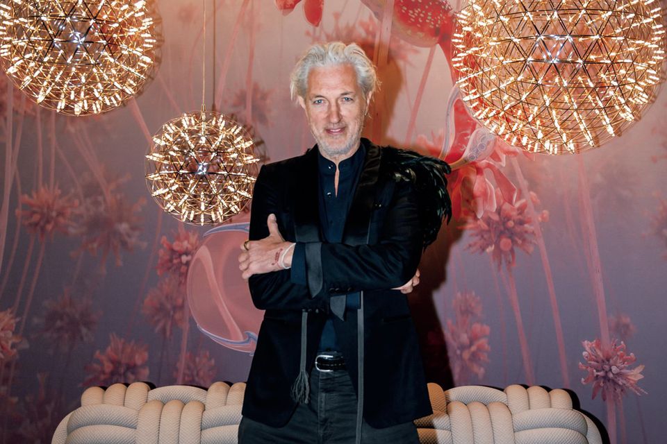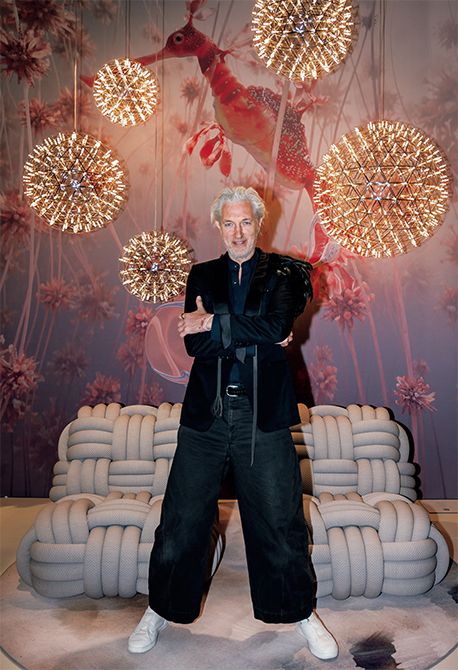 身長190センチ以上で、華やかなロックスターのような出で立ちだが、モーイ創業前後に、大学院で経営学を修めたという勤勉家。背後の照明「レイモンド2」は、数学者がデザインしたという点で、限界を押し広げるモーイの哲学を感じさせるヒット商品。