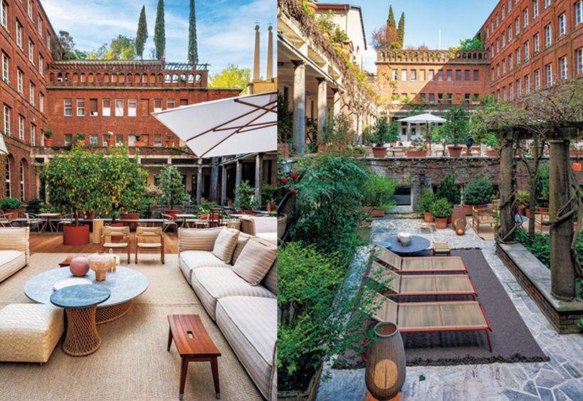 アウトドア家具のコレクションは、通常非公開のミラノ市内のサンタンジェロ教会に併設されている回廊にて展示が行われた。ミラノの建築界の巨匠、ジョヴァンニ・ムツィオによる歴史的な建築はフレックスフォルムのデザイン理念と深く共鳴し、緑豊かな植栽と共に計算された造形物とのバランスが心地よい空間を生み出している。