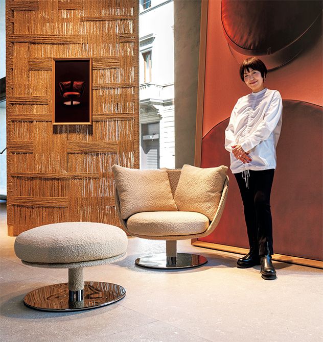 新発表された「エリ」の回転式モデルとオットマンの横に立つデザイナー柴田文江さん。