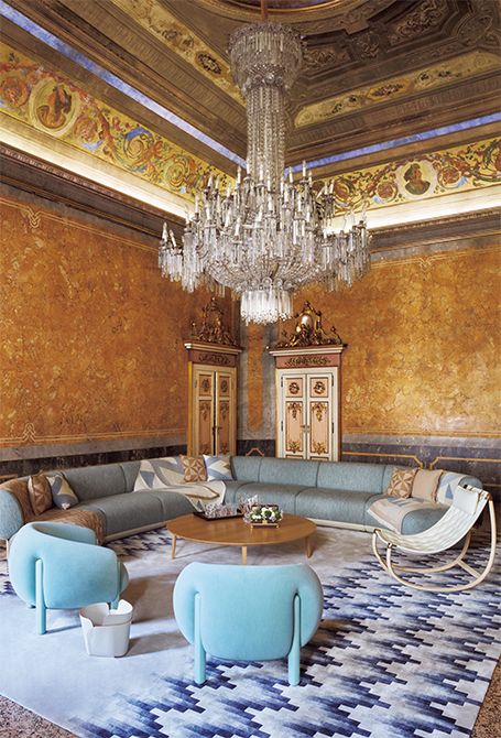 ミラノ市内のセルベローニ宮殿での展示は、気品漂う空間に洗練されたエスプリが感じられるピースが並ぶ。アルゼンチン出身のデザイナー、クリスティアン・モハデッドによるラグのデザインは故郷の山々と氷河にインスパイアされたグラフィック。(©LOUIS VUITTON)