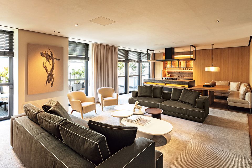 ブランドの新旧のアイテムを組み合わせた、LDKからテラスまで一体感ある巧みなコーディネートを体感できます。中央のソファは、昨年発表された「オーガスト」(幅270×奥行き100×高さ63〈座面高40〉センチ~、220万2200円~)。